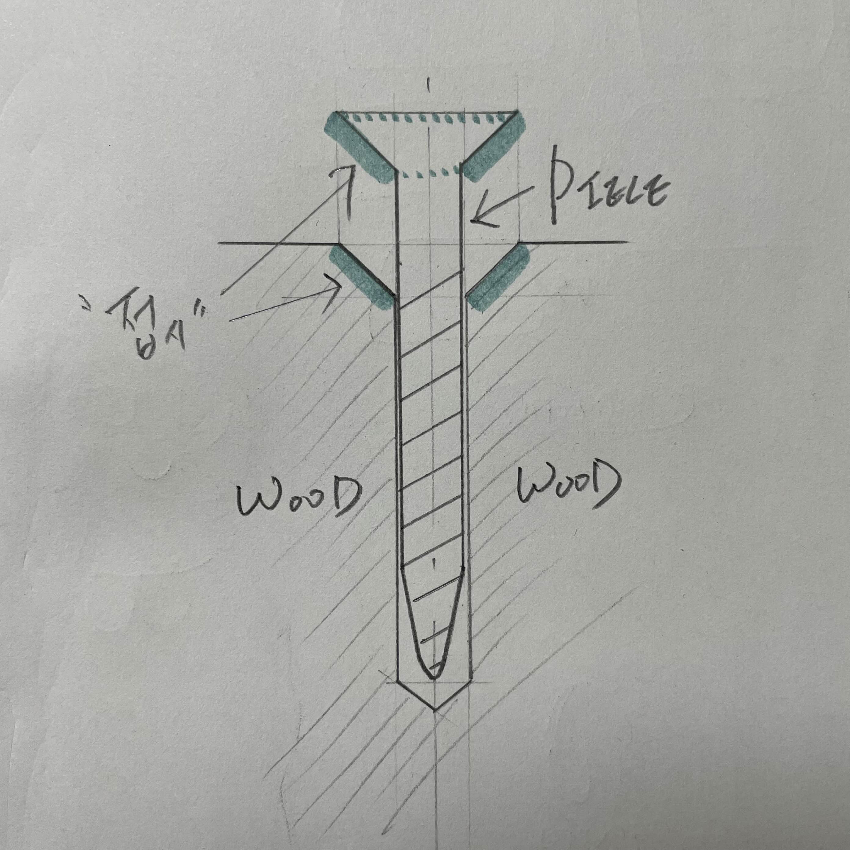 아래 사진은 목재에 이중드릴비트로 작업한 후 접시머리나사를 체결하는 모습을 그렸는데, 그림에 소질이 없어 도리어 혼돈을 주지는 않을까 걱정됩니다. 푸른색의 굵은 형광펜이 표시된 부분이 목재와 피스(Piece)가 결합되어 붙는(작업 후에는 보이지 않는 부분) 부분입니다.