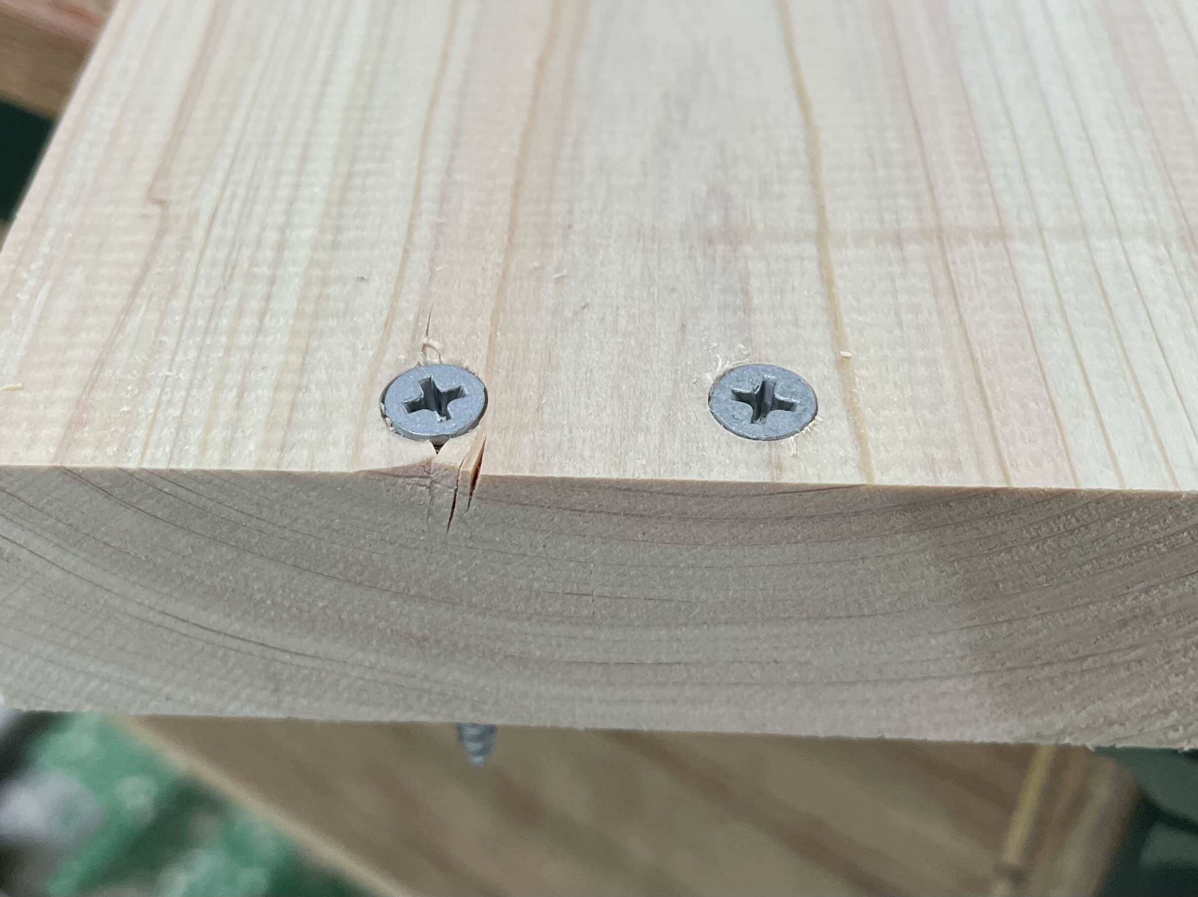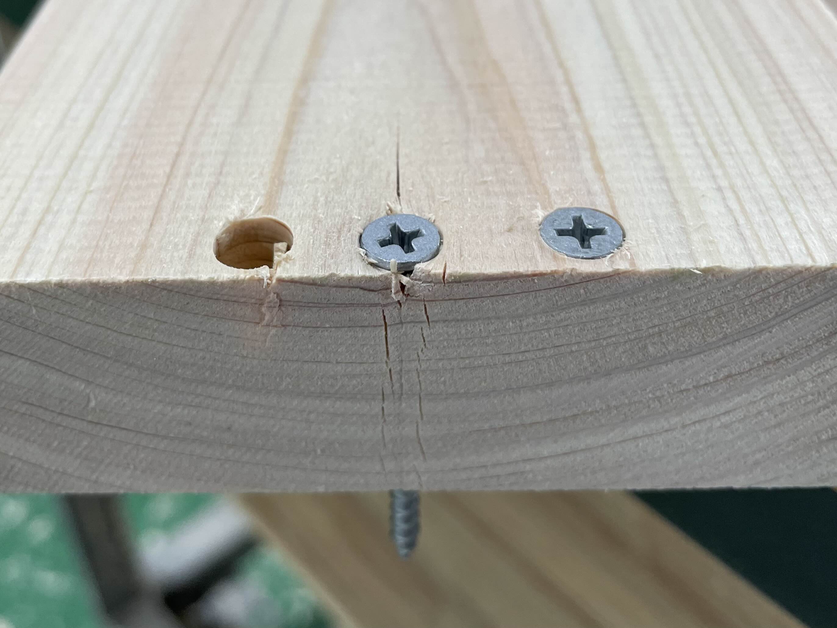 양쪽은 이중드릴비트를 이용하여 미리 홀(Hole) 작업을 했으며, 중앙 부분은 그 작업 없이 피스를 체결한 후의 사진입니다. 이렇듯 무늬결 부분과 마구리면에 크랙을 확인할 수 있습니다.