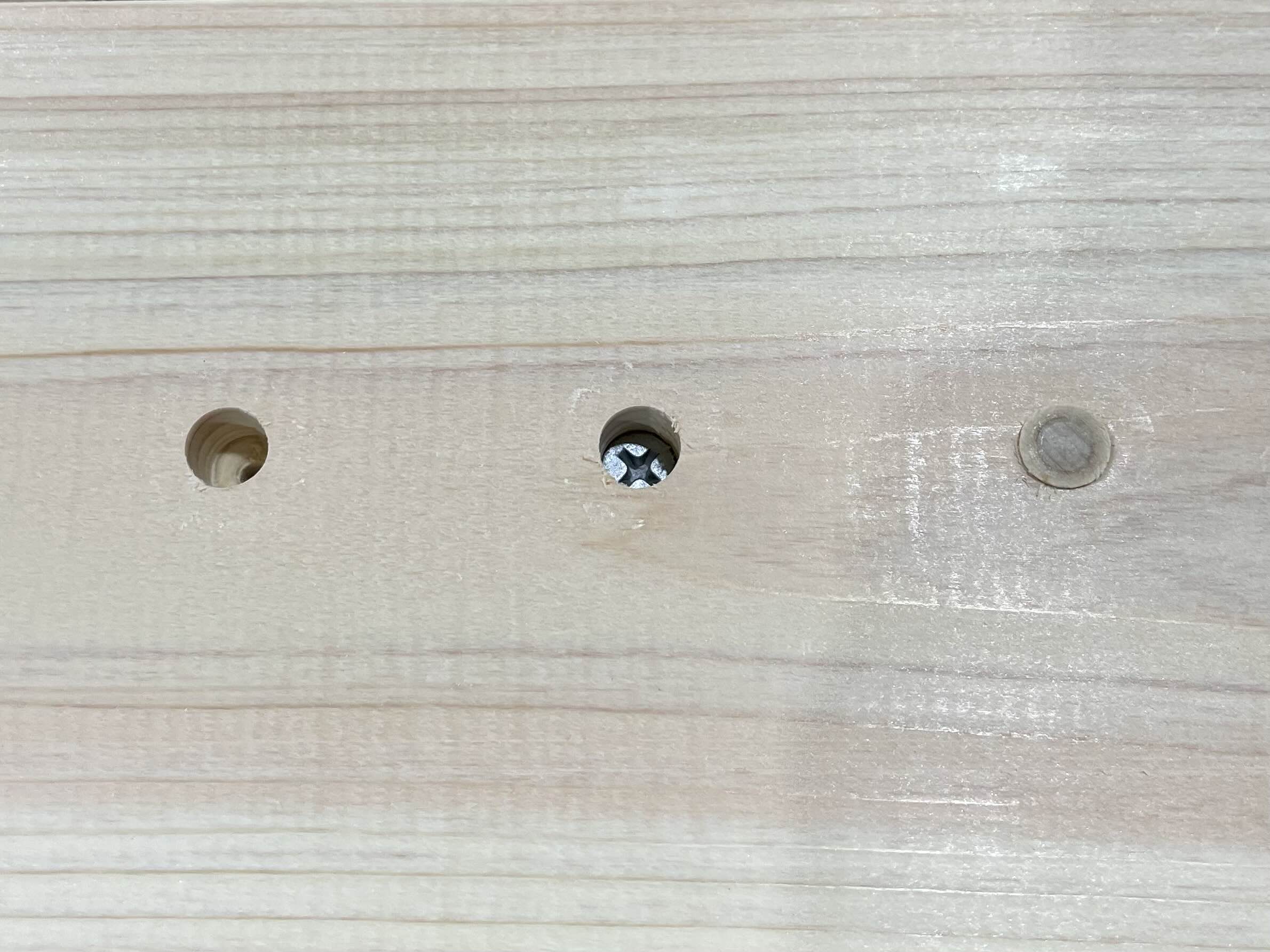 첫 번째는 이중드릴비트 작업만, 두 번째는 피스 작업까지, 세 번째는 목다보를 끼워 넣은 모습입니다.