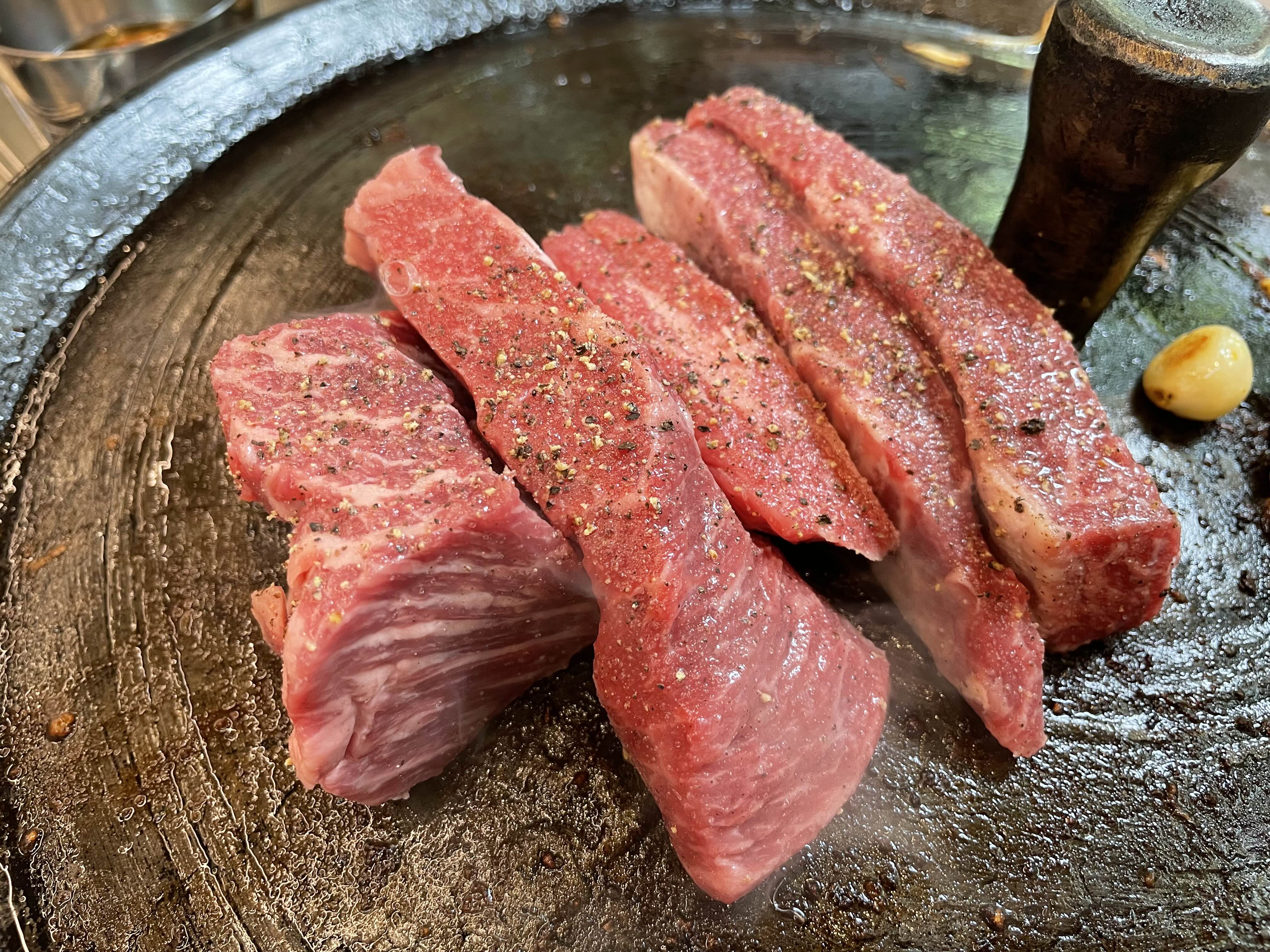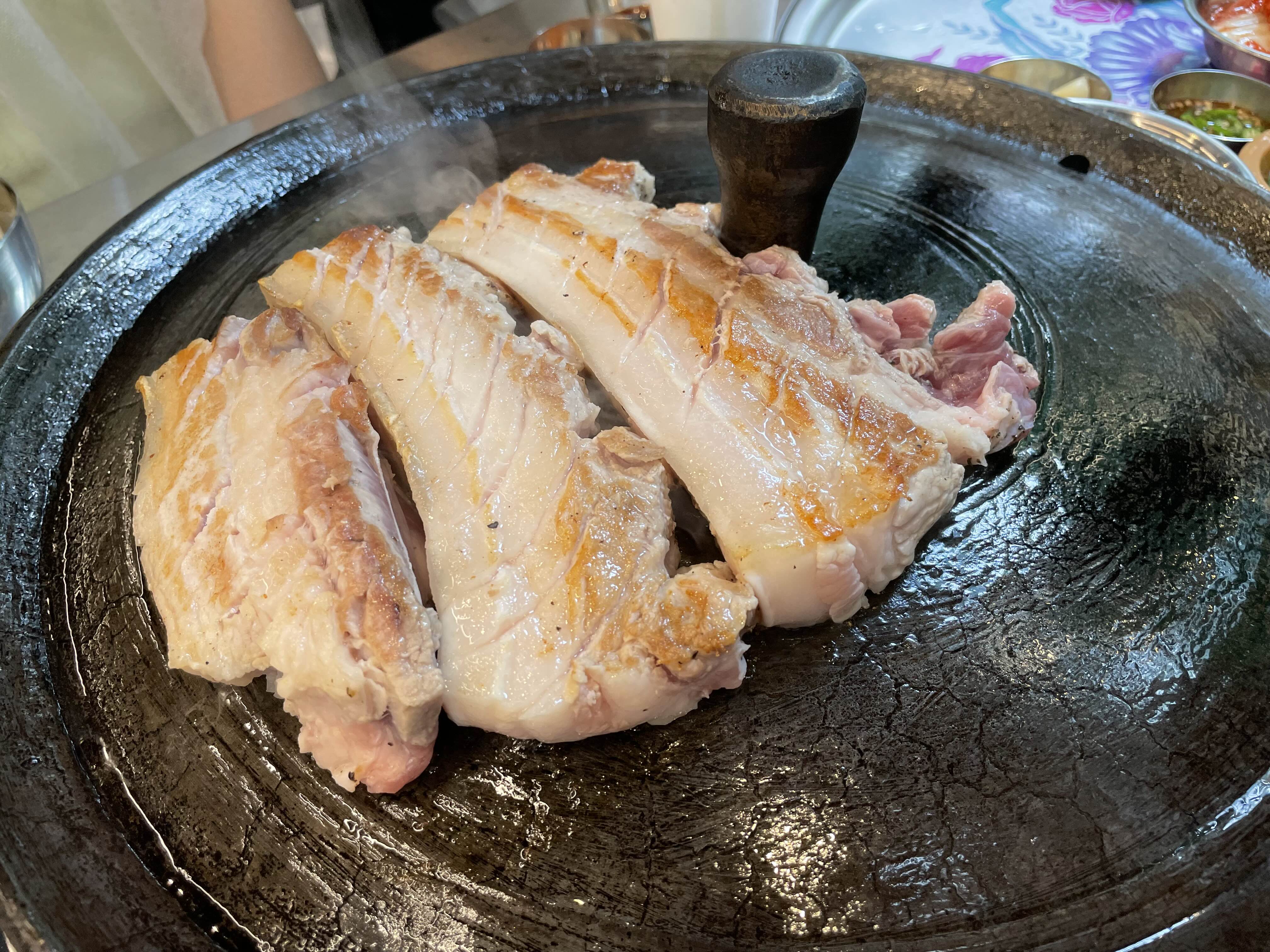 작지만 적당히 도톰한 솥뚜껑에 삼겹살이 익어간다. 삼겹살의 맛은 숙성을 강조했던 왕소금구이 광명 1호점(https://yepes.tistory.com/610)의 맛과 비슷하다. 숙성이 맛의 비밀이라 경쟁업소를 교란 상태로 빠트리기 위해 그 문구를 만들었나 보다. '숙성이고 나발이고 좋은 고기가 맛있......'