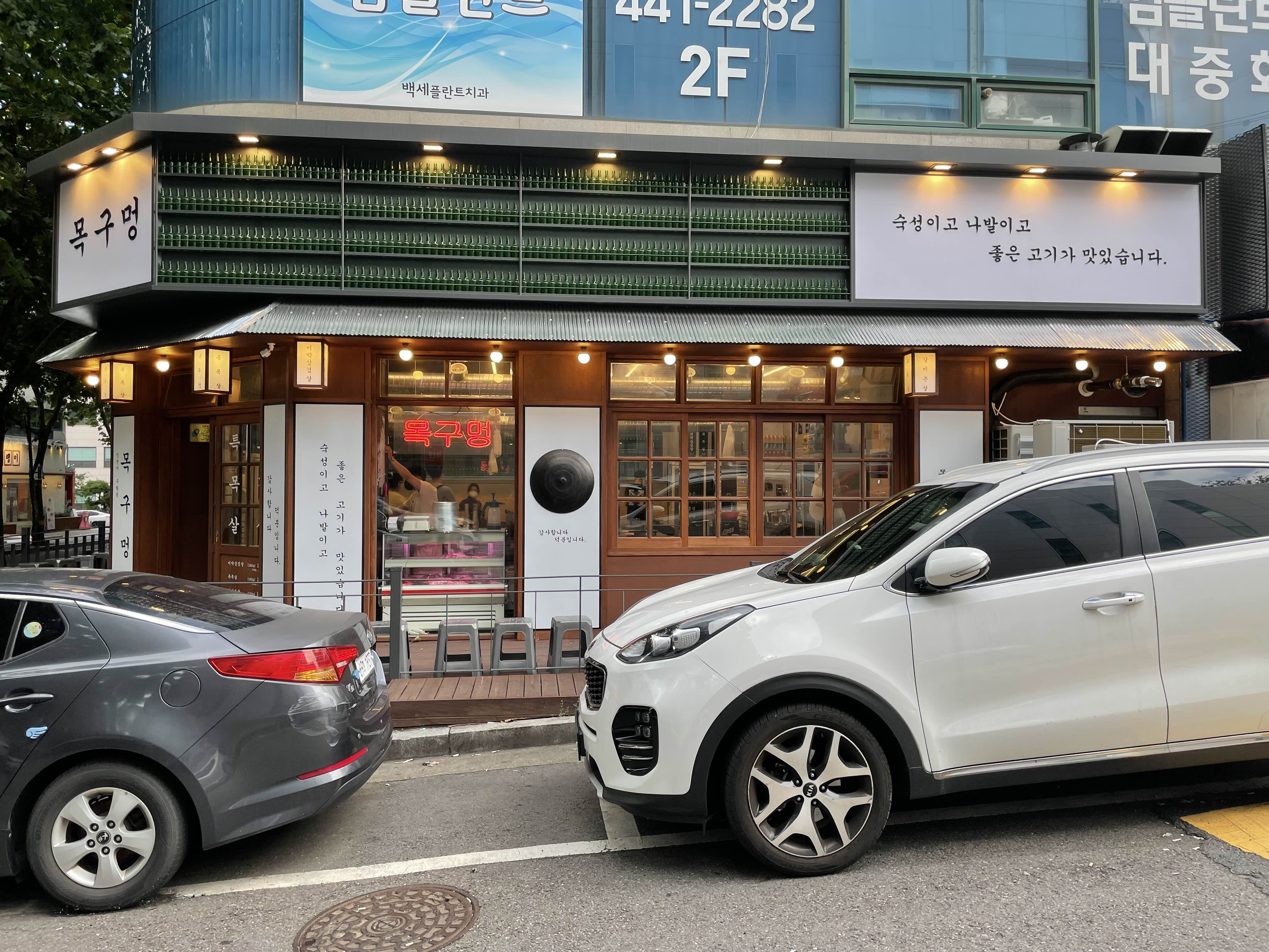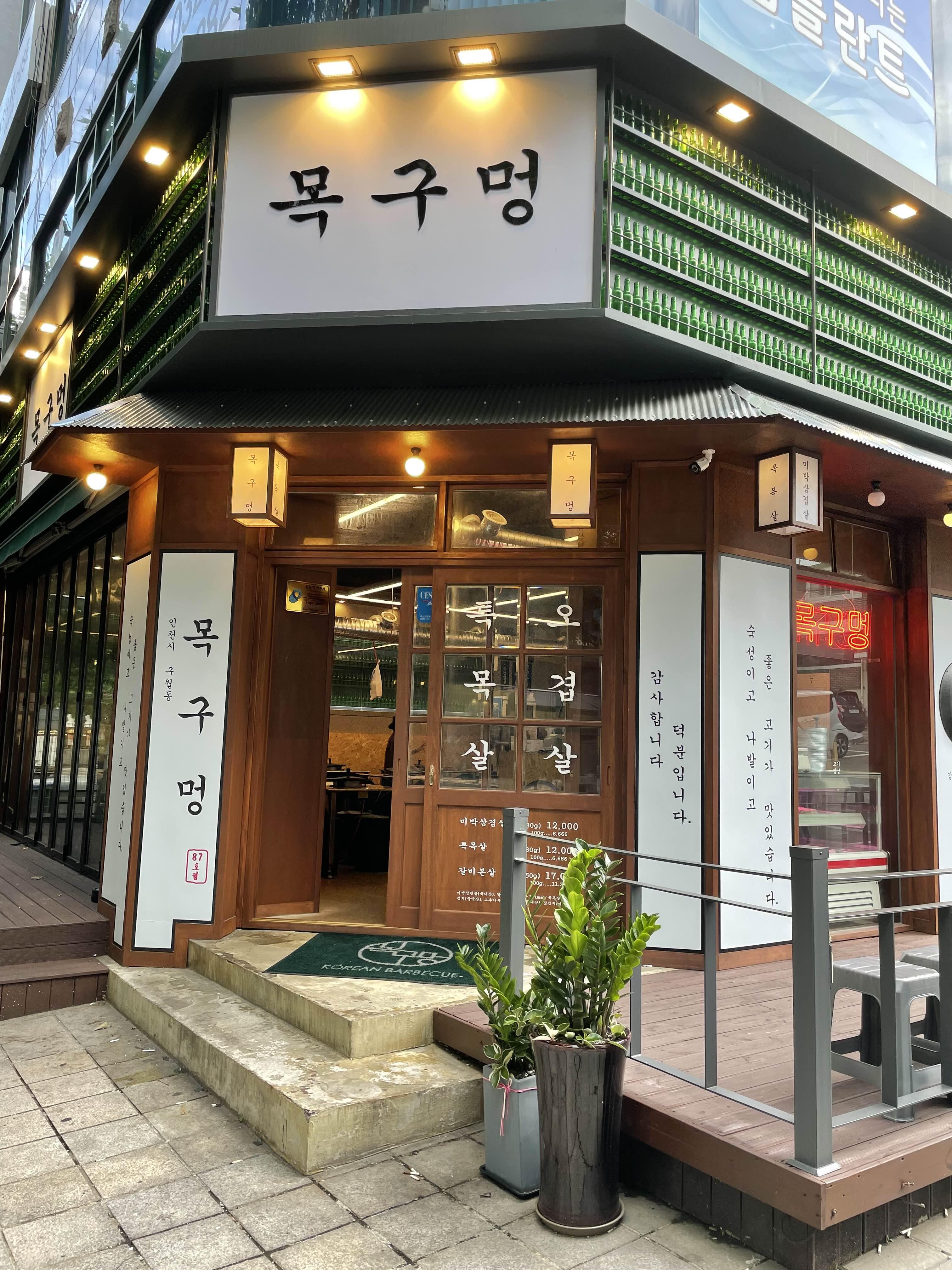 삼겹살을 먹고자 집에서 이곳을 찾은 것은 아니다. 호캉스를 즐기기 위한 숙소가 인천 구월동 로데오 거리에 위치했기에 숙소에서 가까운 곳을 찾아온 곳이 여기다. 하얀색 바탕에 궁서체로 "숙성이고 나발이고 좋은 고기가 맛있습니다."라는 문구가 목구멍이라는 상호보다 먼저 눈에 띄었다. 그 사이에는 소주병으로 가득 장식을 했다. 이 음식점의 성격이 잘 드러난다. 음식점 검색의 총책임자 우리 작은 딸이 찾은 곳이며, 그 책임자를 따라 들어간다.
