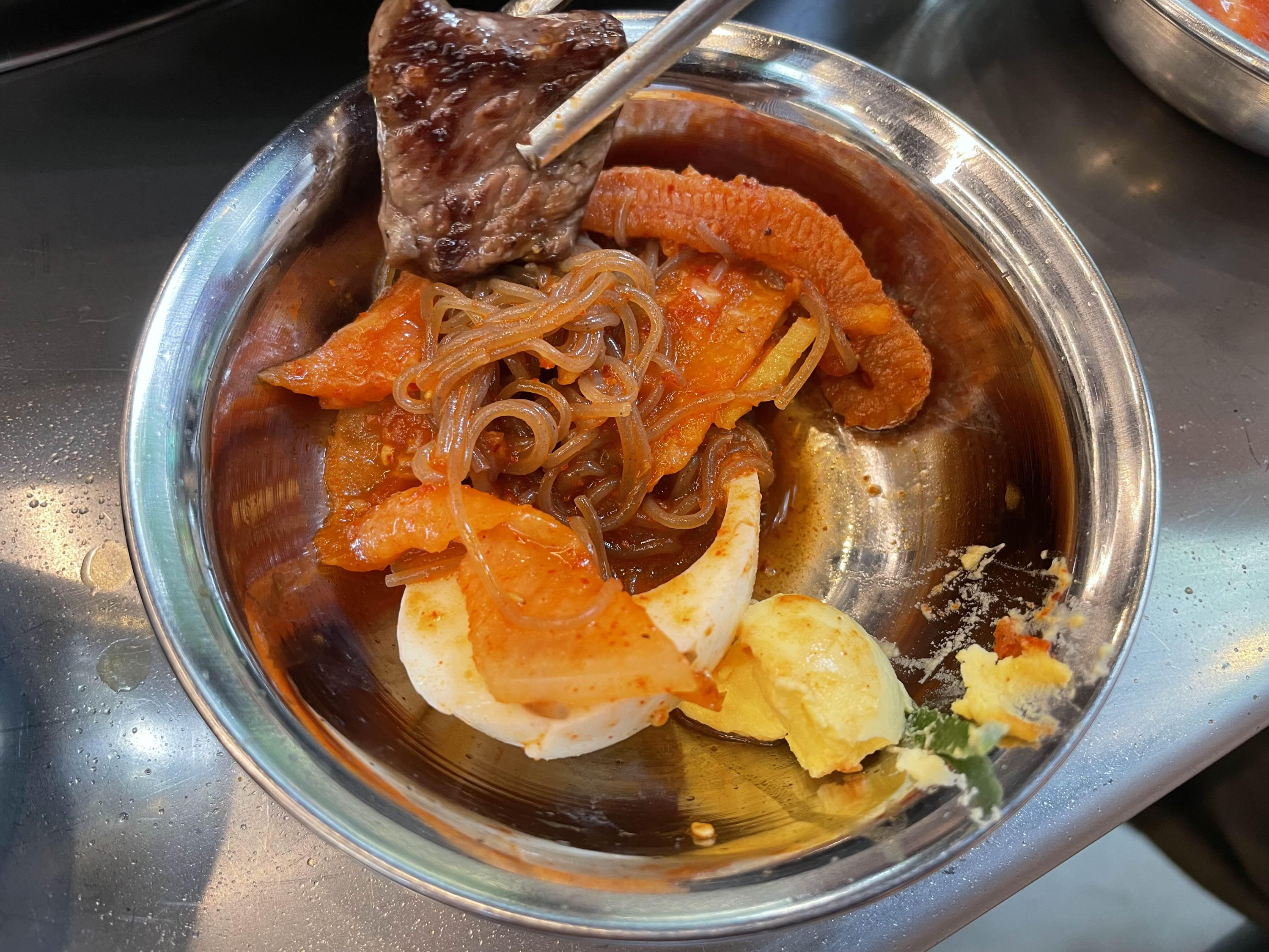 나중에 불판의 고기가 익을 무렵 올려졌던 김치는 맛이 미쳤다. 구워 먹는 것이 아까워 불판에 올려졌던 김치가 원래 접시로 다시 옮겨졌다. 반찬이 메인이고 고기는 덤인 듯 맛있다.