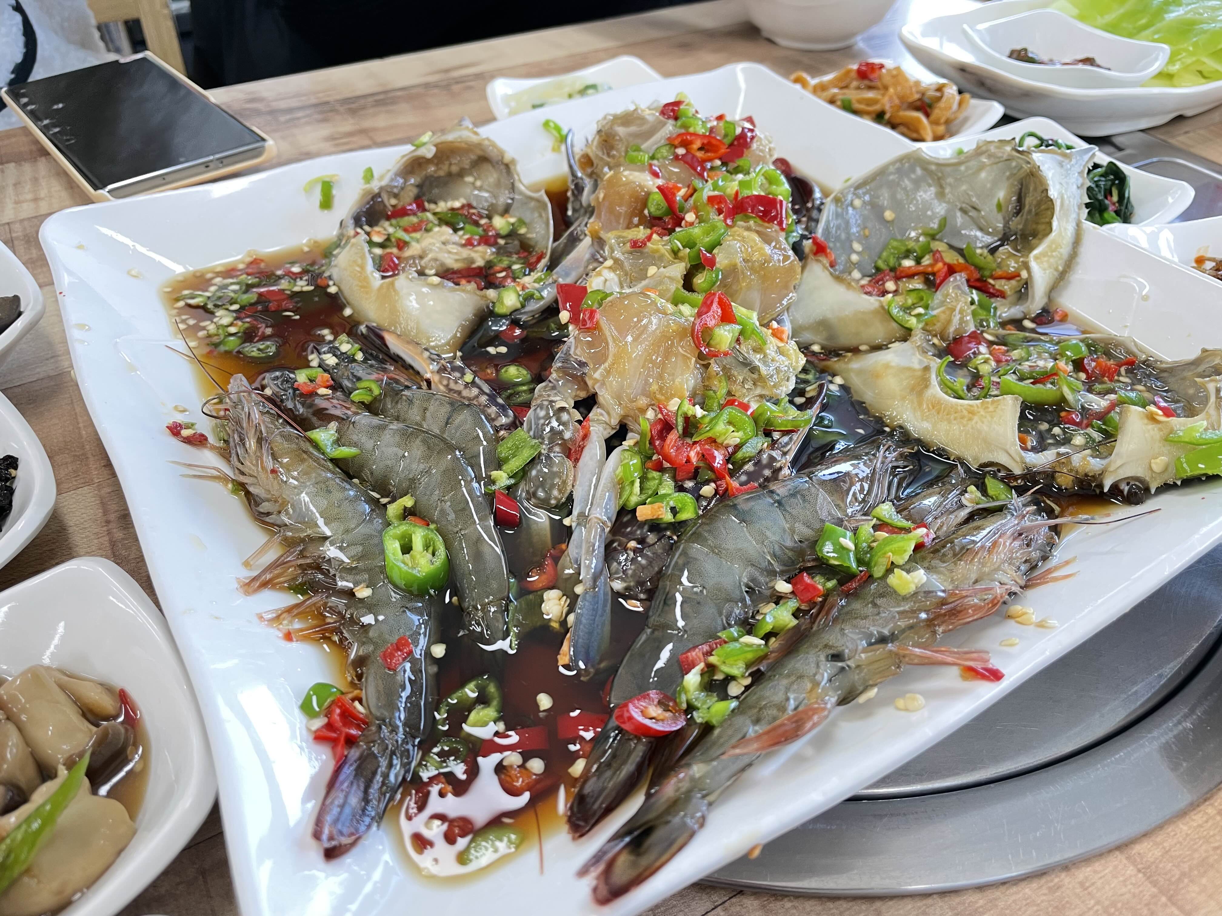 모든 사진이 이날 촬영한 것이나 아래 사진만은 금년 2월, 수노을을 처음 왔을 때 찍은 것이다. 메인 사진이 간장게장 사진인데 마침 그 사진이 이상하게 찍혀 과거 사진으로 대체했다. 새우장이 부족하지 않게 곁들여졌다.