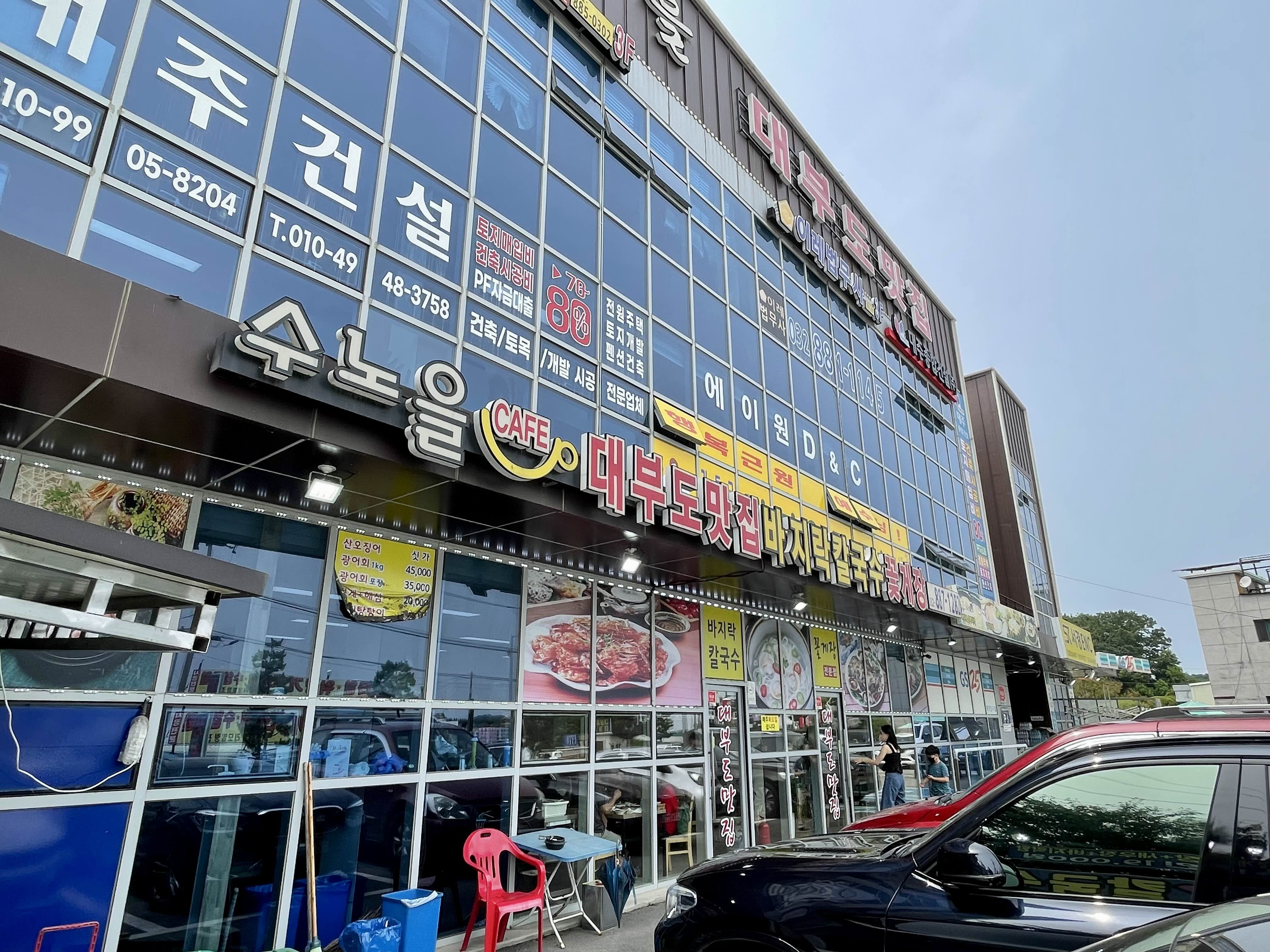 '수노을 카페 대부도맛집 바지락 칼국수 꽃게장'이라고 간판되어 있다. 그리고 건물 상단부에는 '수노을 대부도 맛집'이라고 되어 있는 것으로 봐서 이 집의 상호는 '수노을'인가 보다.^^~ 세 번째 방문이라 출입구가 어딘지, 주차는 어디가 편한지, 담배는 어디서 펴야 하는지를 안다.ㅎㅎ