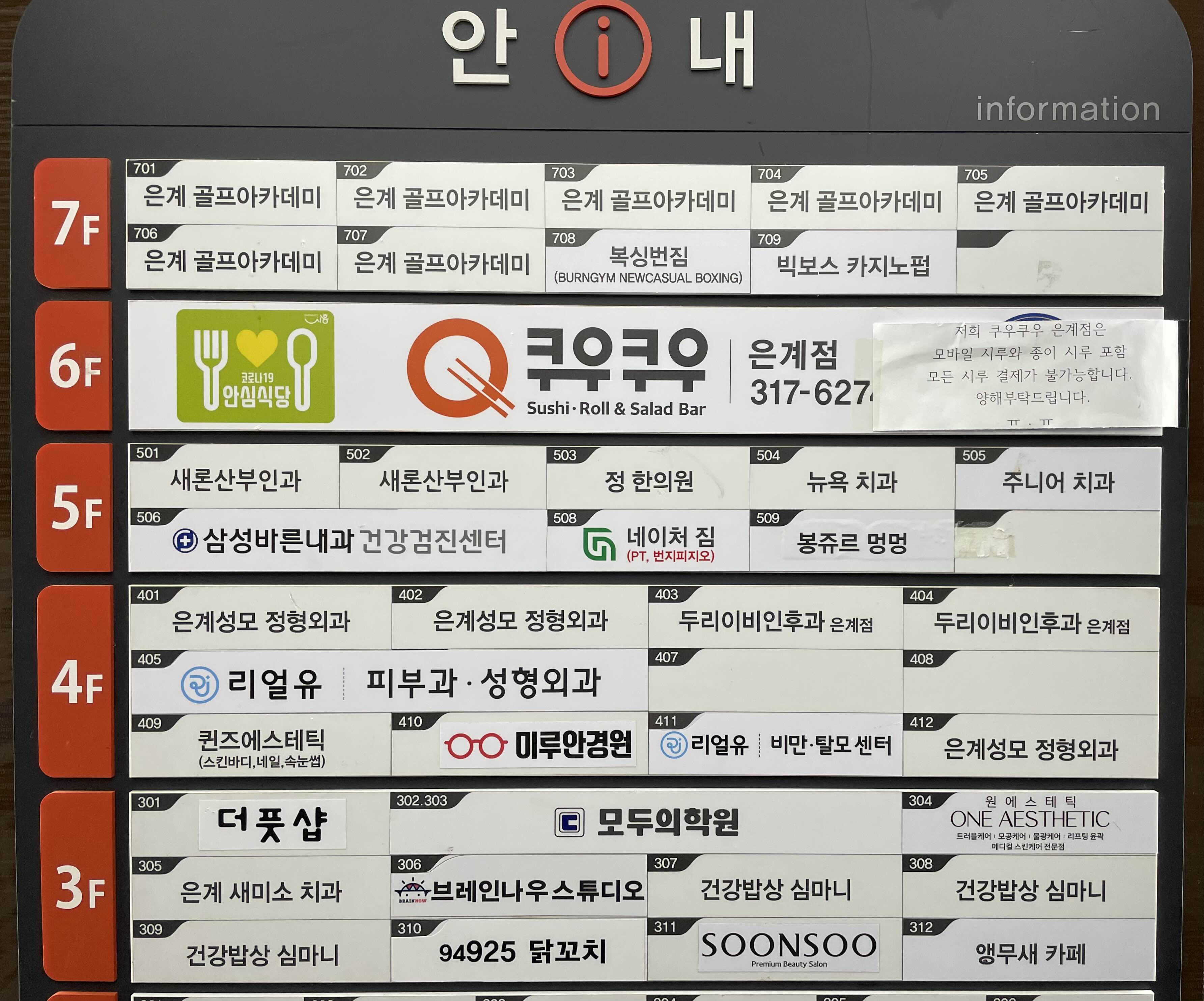 은계타운 내부에 층별 안내문이 잘 정리되어 있다. 6층 버튼을 누르면 된다.