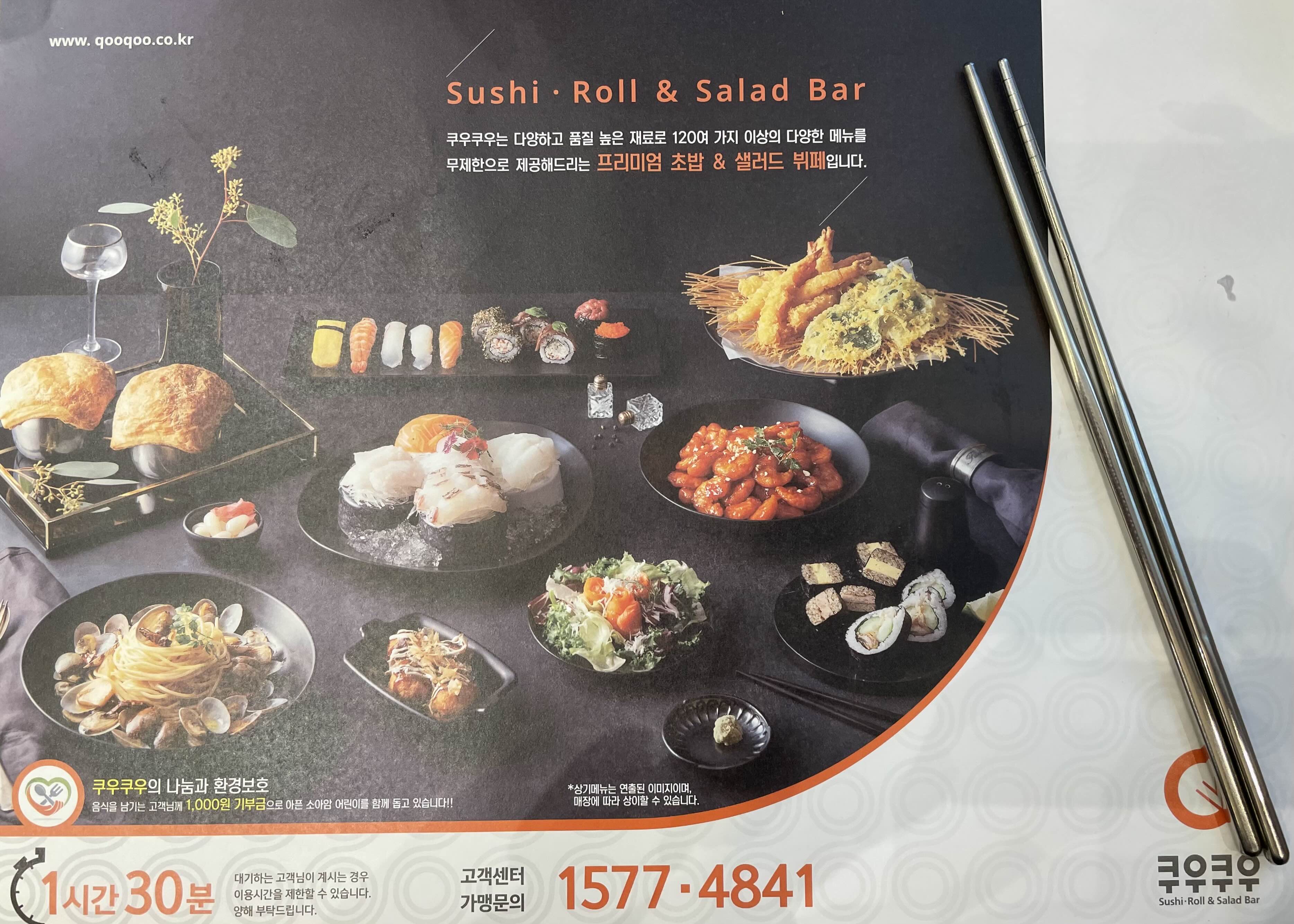 어느 정도 배가 채워지니 이것저것 보이기 시작한다. 테이블에 깔려 있는 전단지가 눈에 들어 촬영해 봤다. 1시간 30분이라는 제한 시간이 눈에 띈다. 시간에 쫓길 이유가 없는 충분한 시간이다. 참고로 우리 식구, 천천히 골라먹고, 디저트까지 모두 즐겼음에도 1시간이 채 걸리지 않았다.