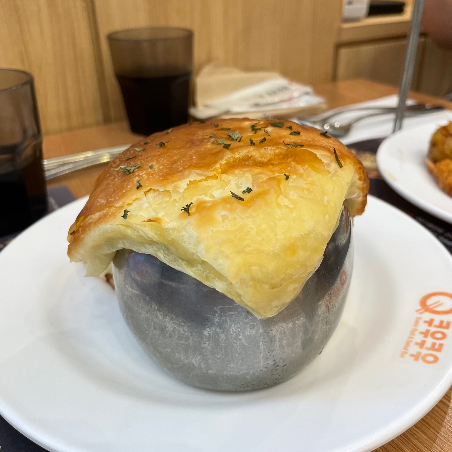 아래 사진의 모습은 쿠우쿠우 은계점의 시그니처 메뉴라 할 수 있다. 다른 어떤 뷔페에서도 볼 수 없었던 메뉴! 직원으로부터 자리를 배정받을 때 주변 테이블에 '스댕 밥그릇'이 놓여 있는 것을 보고 "저건 또 뭐야?" 했는데, 우리 큰 딸이 어디서 집어왔다. 속은 수프가 들어있고 빵으로 뚜껑 삼아 덮었다.